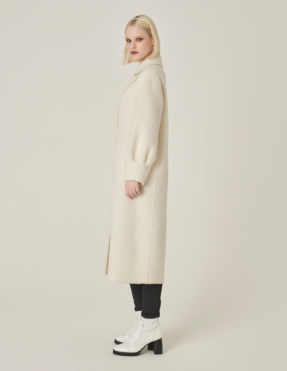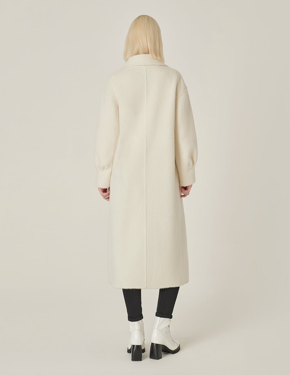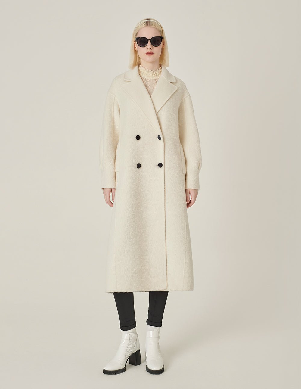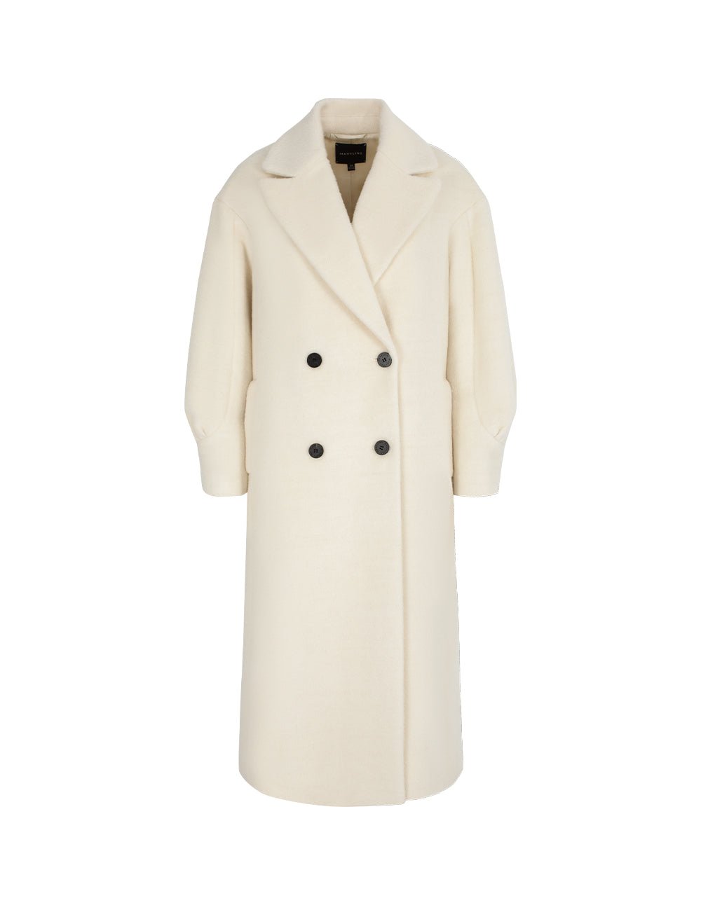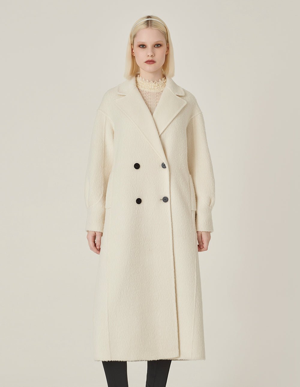 MARYLING’s coat is made entirely of alpaca fabric. which is softer and more skin-friendly than mohair. The H version has a simple lapel design and pleated details on the sleeves. adding a fashionable design feel. Pure white alpaca wool is more low-key. showing luxury and nobility.