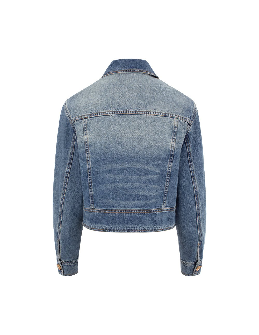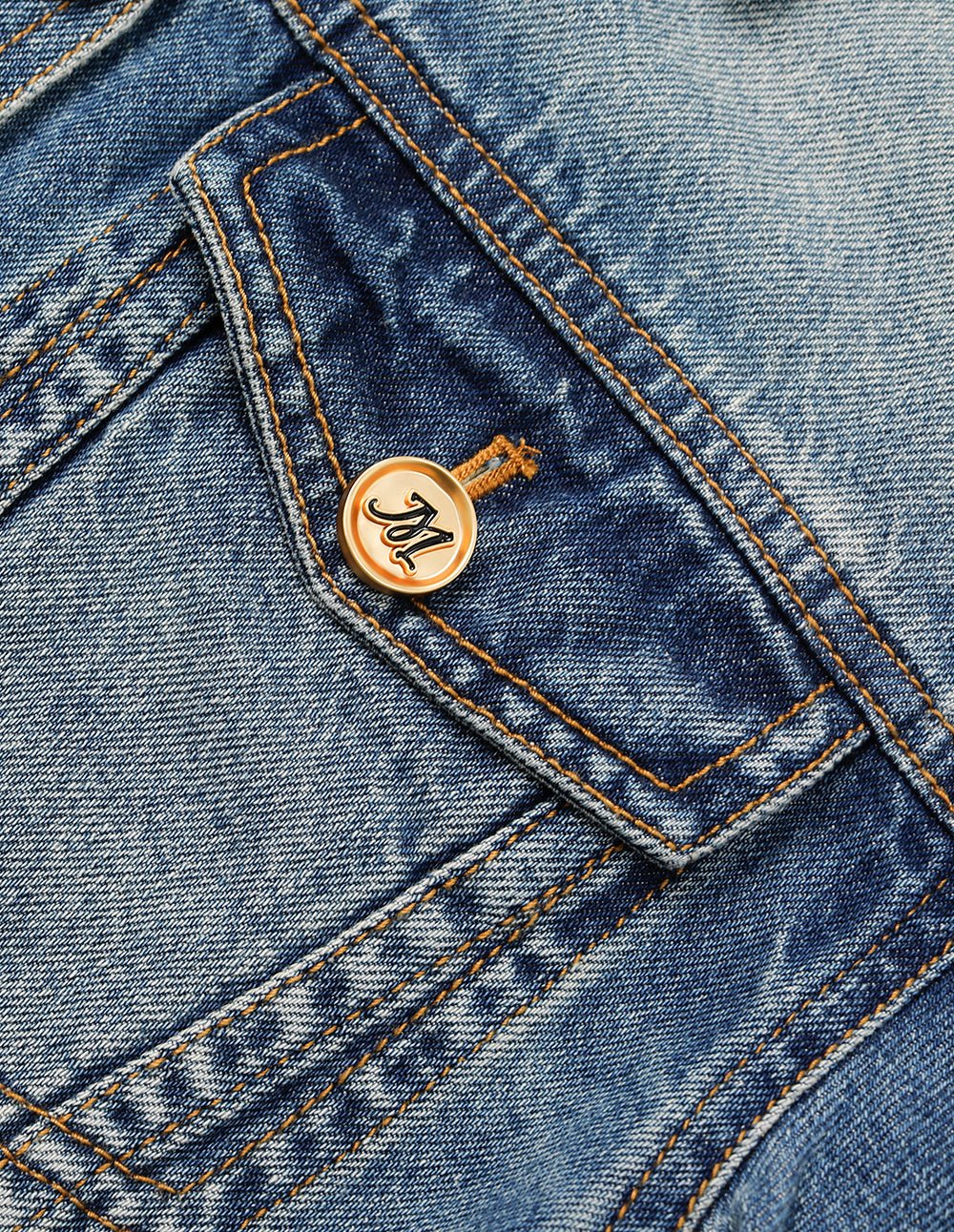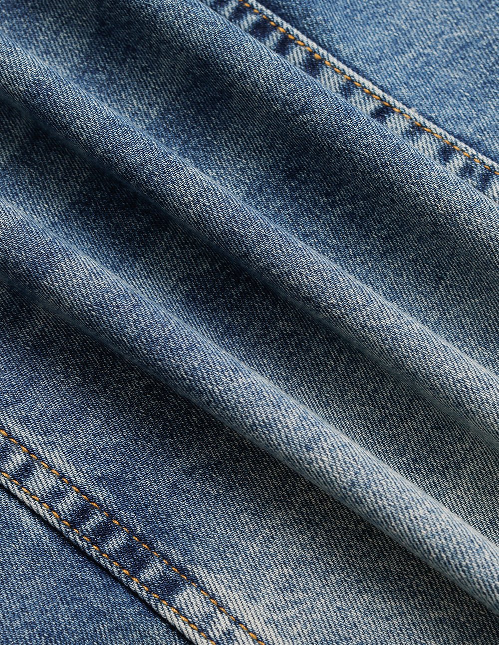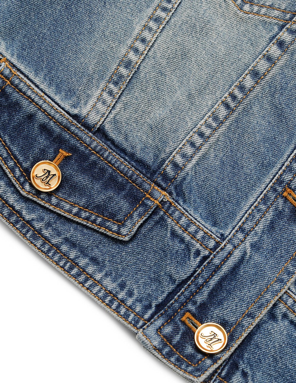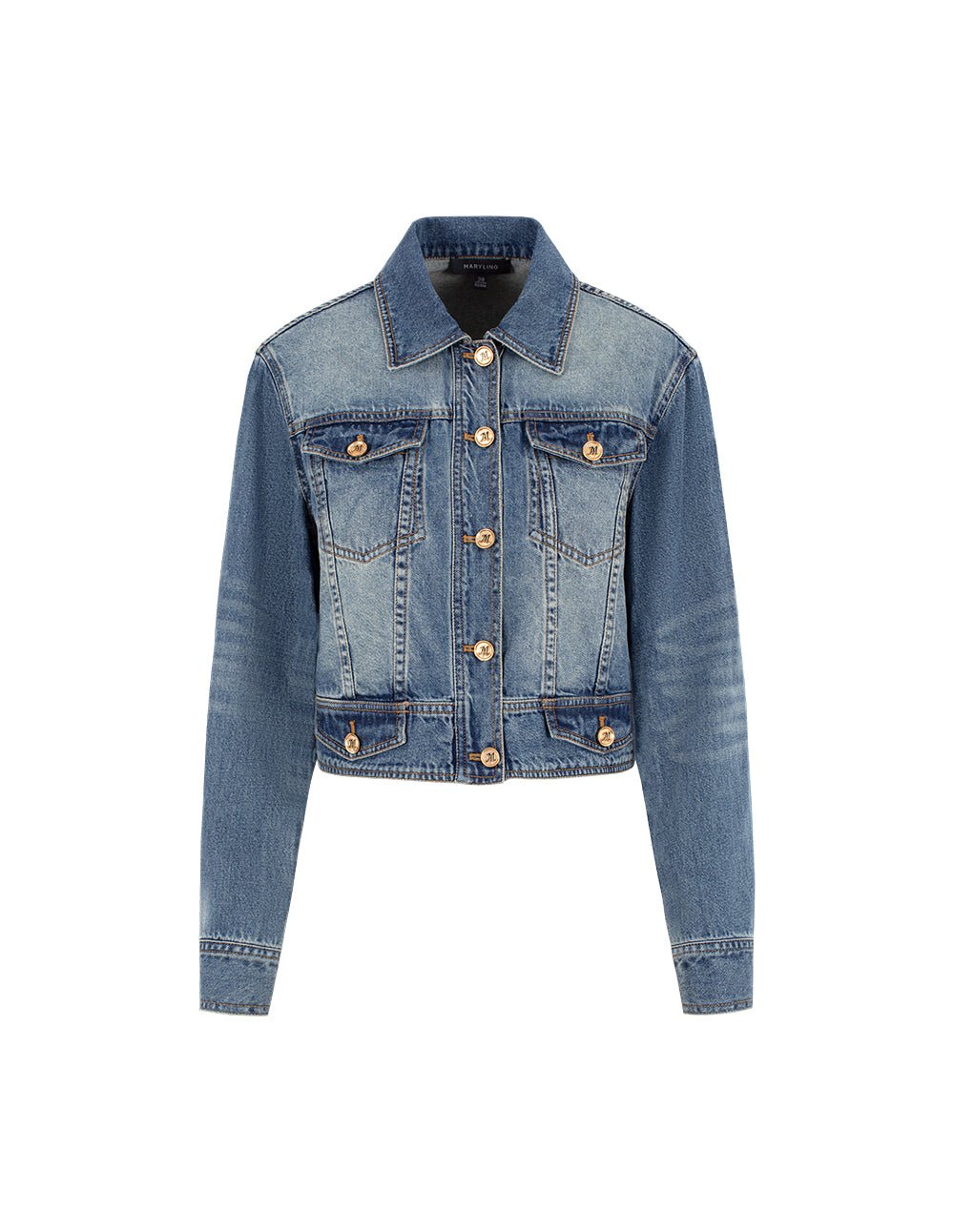 This denim jacket is precisely tailored and subtly outlines the figure like a tailor-made. It has multiple pocket elements and gold and copper buttons. playing a retro tune. Let your every move exude nostalgic charm; the warm-toned denim blue exudes high-end texture.