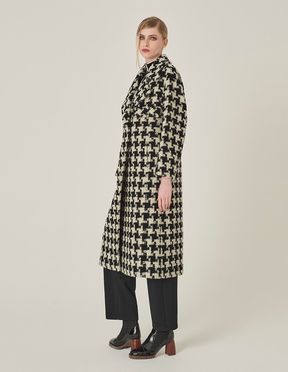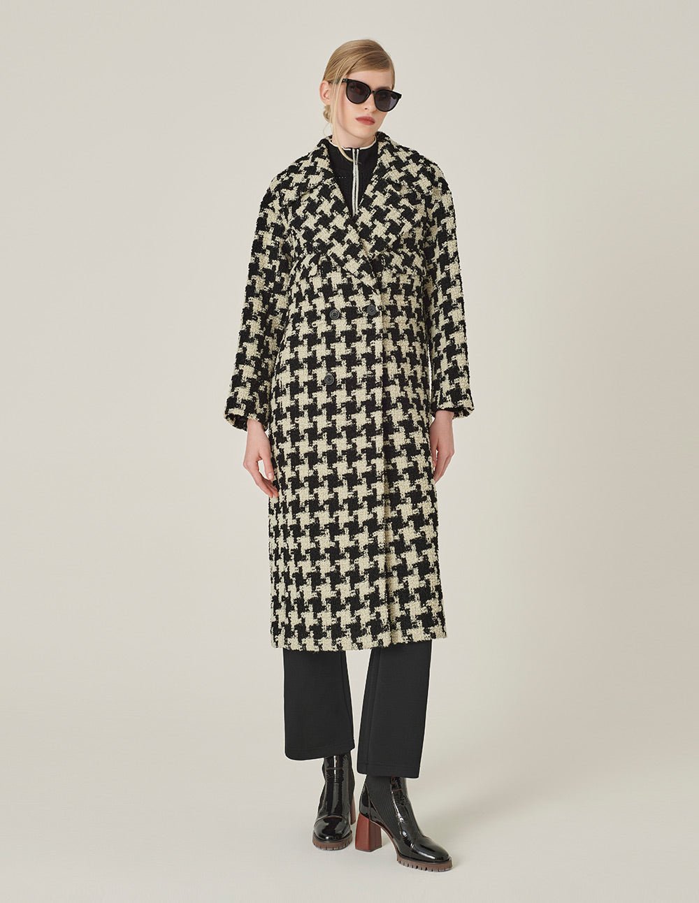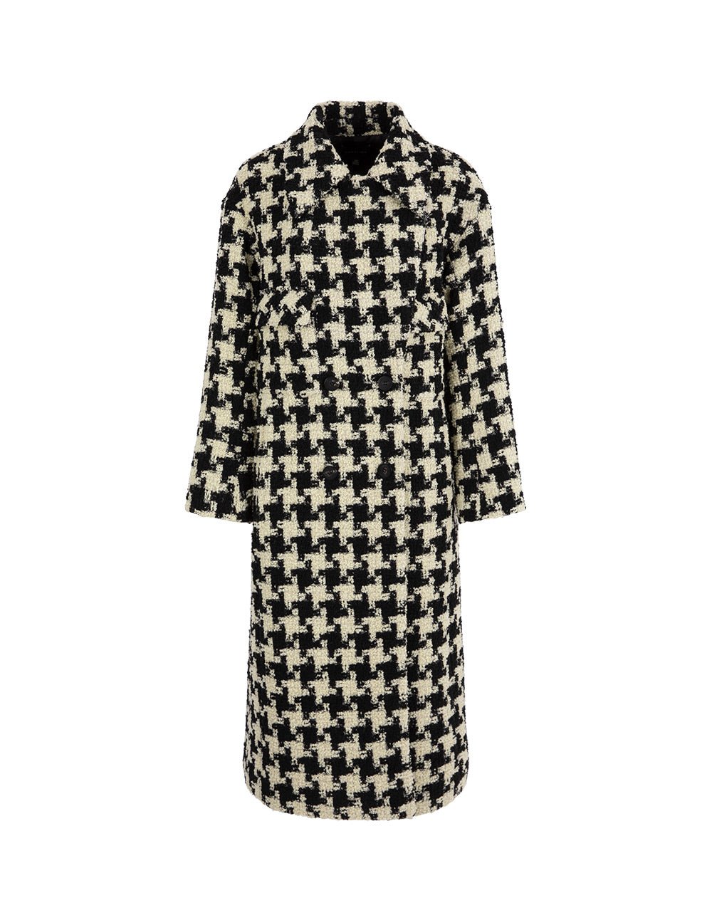 MARYLING’s model is the same one shown in the Milan show. The OVERSIZE style coat uses MARYLING’s classic houndstooth tweed. which is woven with loop yarn and belly yarn to create a velvet surface and a layered visual effect. The black and white combination is strong and harmonious. making it a fashionable and unique outfit in winter. The H silhouette echoes the asymmetrical three-breasted design and embellishes the details. The lapels can be worn standing up according to personal dressing preferences. and they can be worn as a double dress to add different wearing experiences.