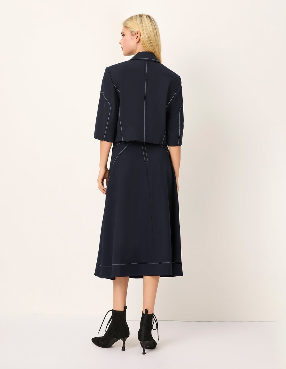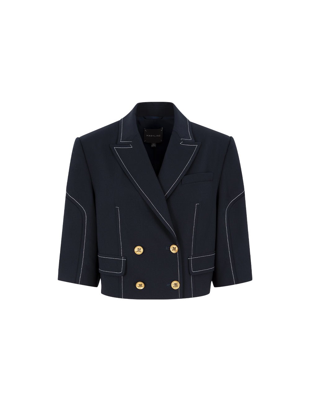 MARYLING’s jacket uses contrasting white topstitching to outline the details. with a slightly looser short version and exquisitely designed three-quarter sleeves. creating a sweet and cool fashionable outfit. It can be worn as a set with a skirt with the same elements to show your intellectual and artistic temperament.