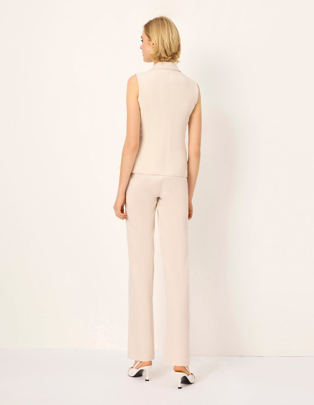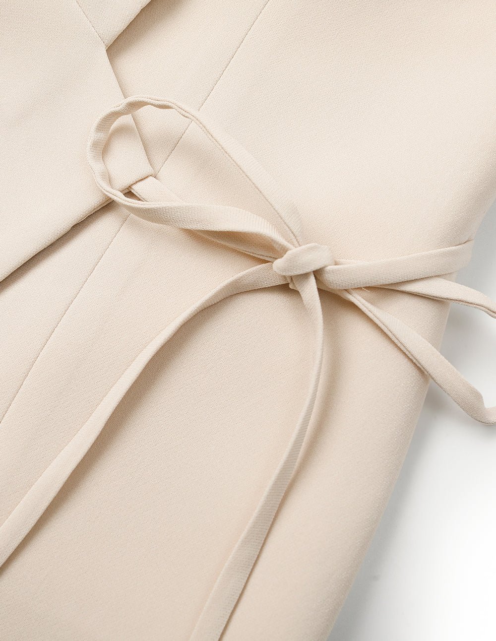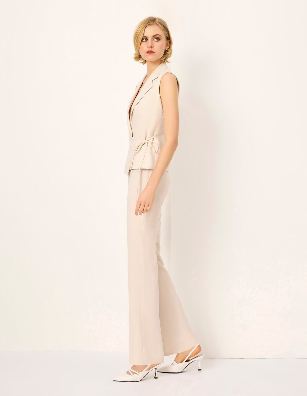 The suit collar is designed to three-dimensionally modify the neckline. and is paired with a sleeveless cut to reveal slender arms. The adjustable straps on the side waist cleverly tighten the waist. making it appear slimmer while breaking the stereotype of traditional vests. The apricot tone gently brightens the complexion and perfectly balances the formality of the sharp tailoring.