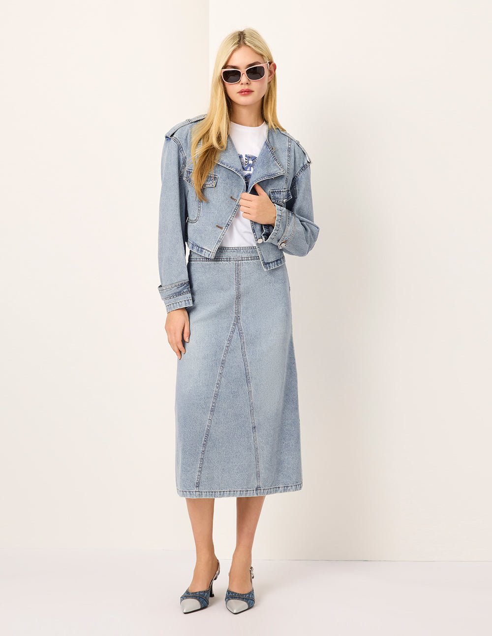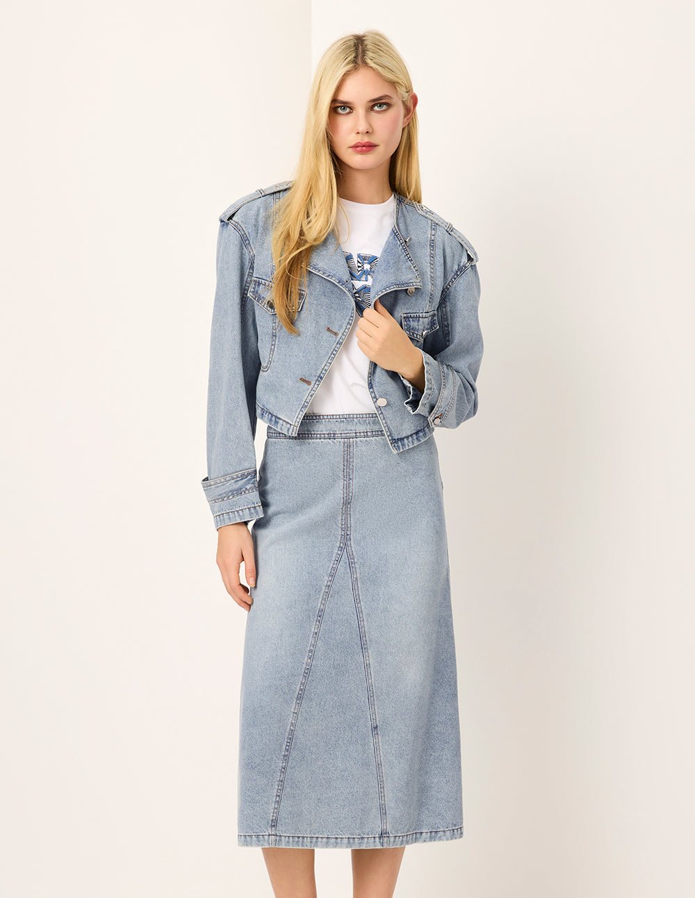 MARYLING’s denim jacket is made into a short version with exquisite craftsmanship. Every cut and every line is precise. and there is no sloppiness. The color tone retains the original color of the denim and can be washed casually. Fresh and full of energy. Several carefully embellished metal buttons shine with a cold and bright luster. breaking the simple monotony of jeans when opening and closing.