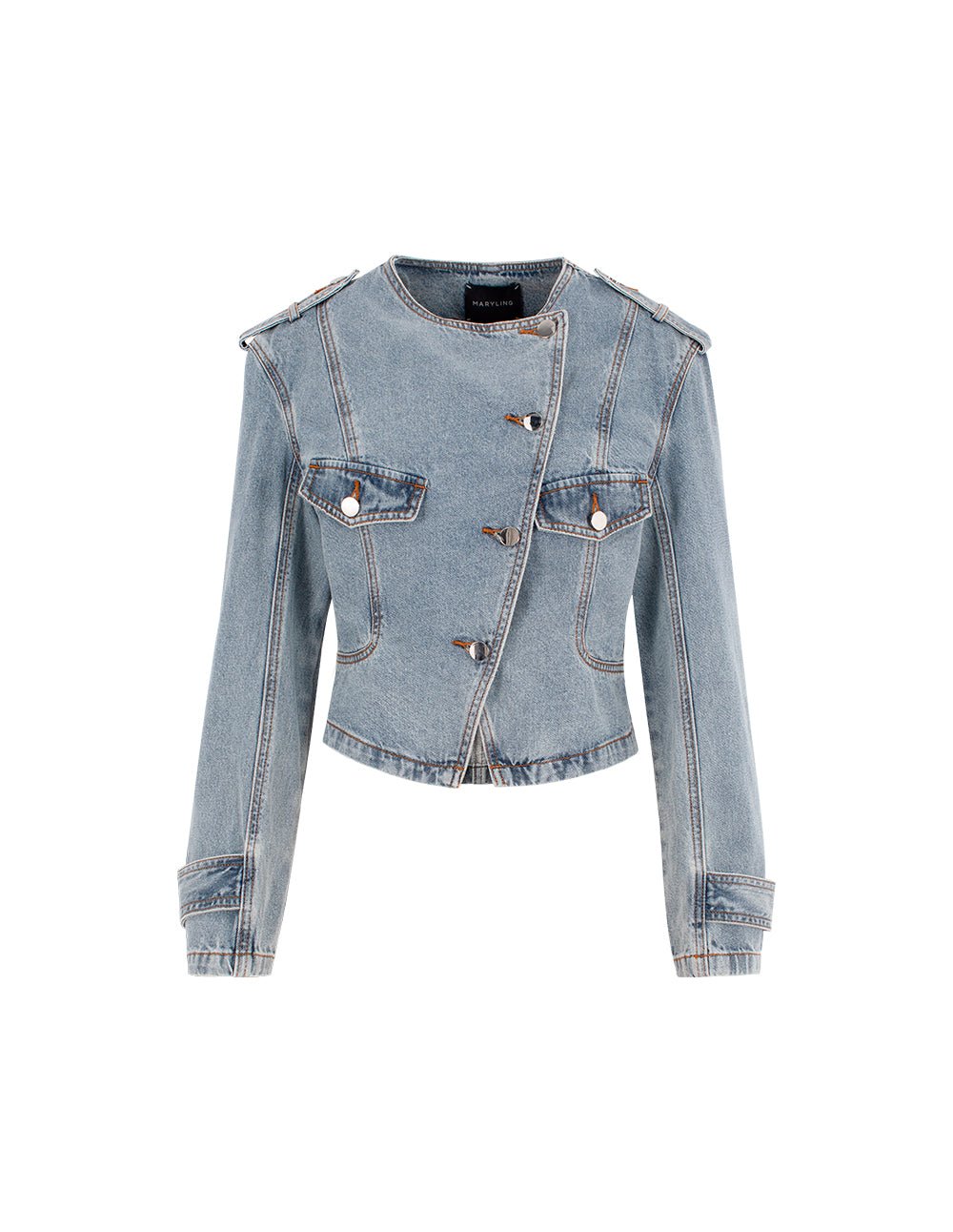 MARYLING Round-Neck Diagonal-Breasted Washed Denim Biker Jacket