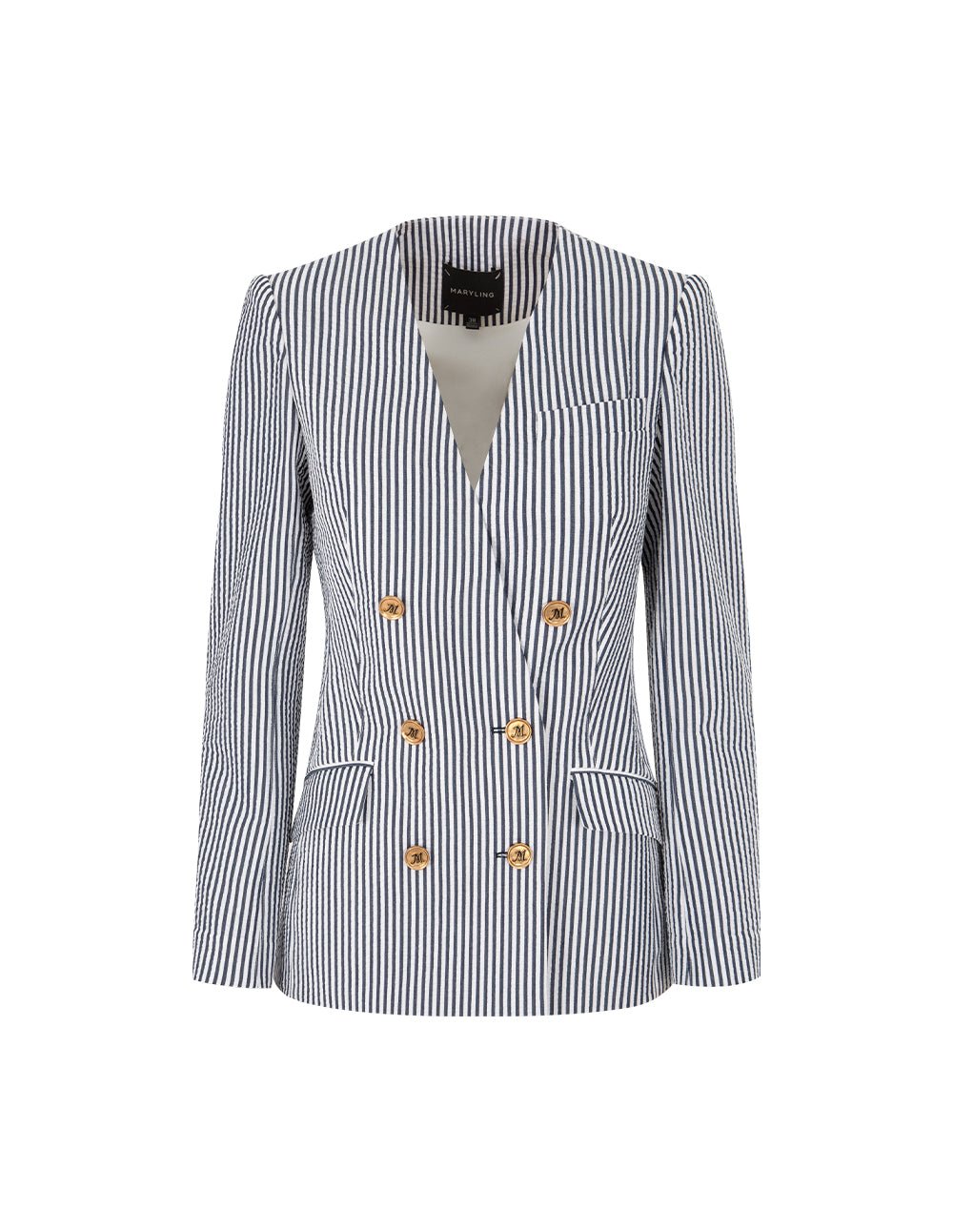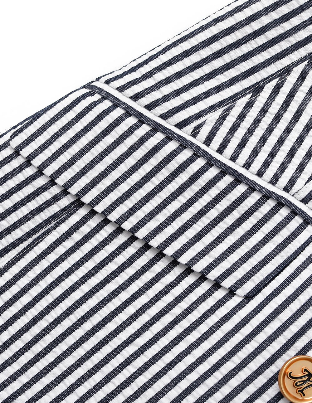 MARYLING’s suit jacket adopts classic nautical style blue and white stripes. which brings a refreshing and free atmosphere. The pinstripes add a sense of slenderness and sophistication. Under the collar. the gold-copper LOGO double-breasted buttons shine with luster. bringing together confidence and strength. The iconic diamond cut is like an invisible sculptor. artfully outlining the silhouette that combines elegance and strength.